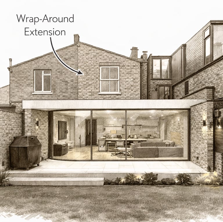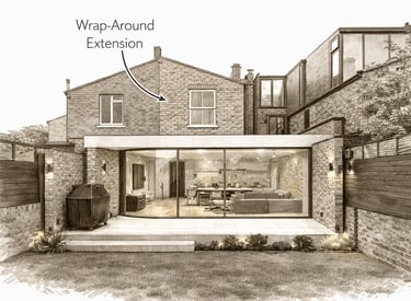 A combination of rear and side extensions, wrap-around extensions maximise available space and allow for complete ground-floor transformations.
