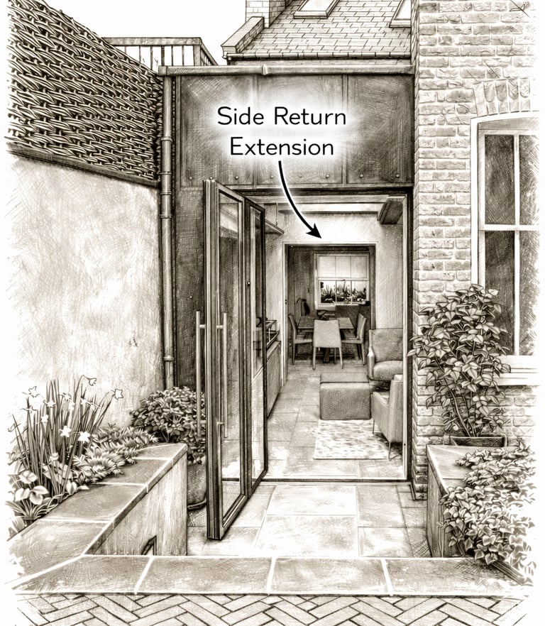 Common in period properties, side return extensions make use of unused side spaces to significantly improve internal layouts, particularly for kitchen and dining areas.
